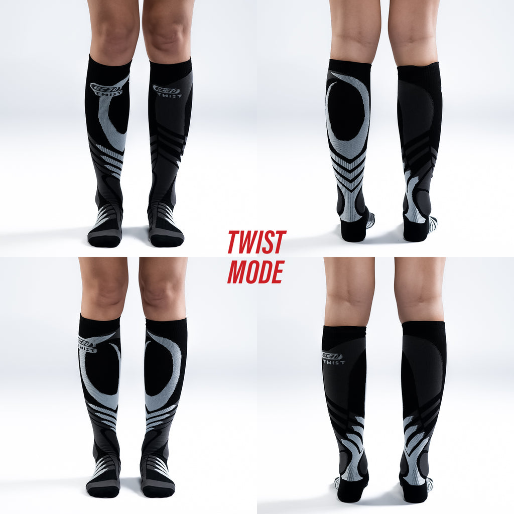 The unique design of our Twist Compression Socks allows you to perform and recover in one twist! Simply slip on your compression socks and start your workout. Once you're ready to switch to recovery mode, pull the sock down to the bottom of your ankle, twist it outward (rotate 180 degrees), and pull it up.